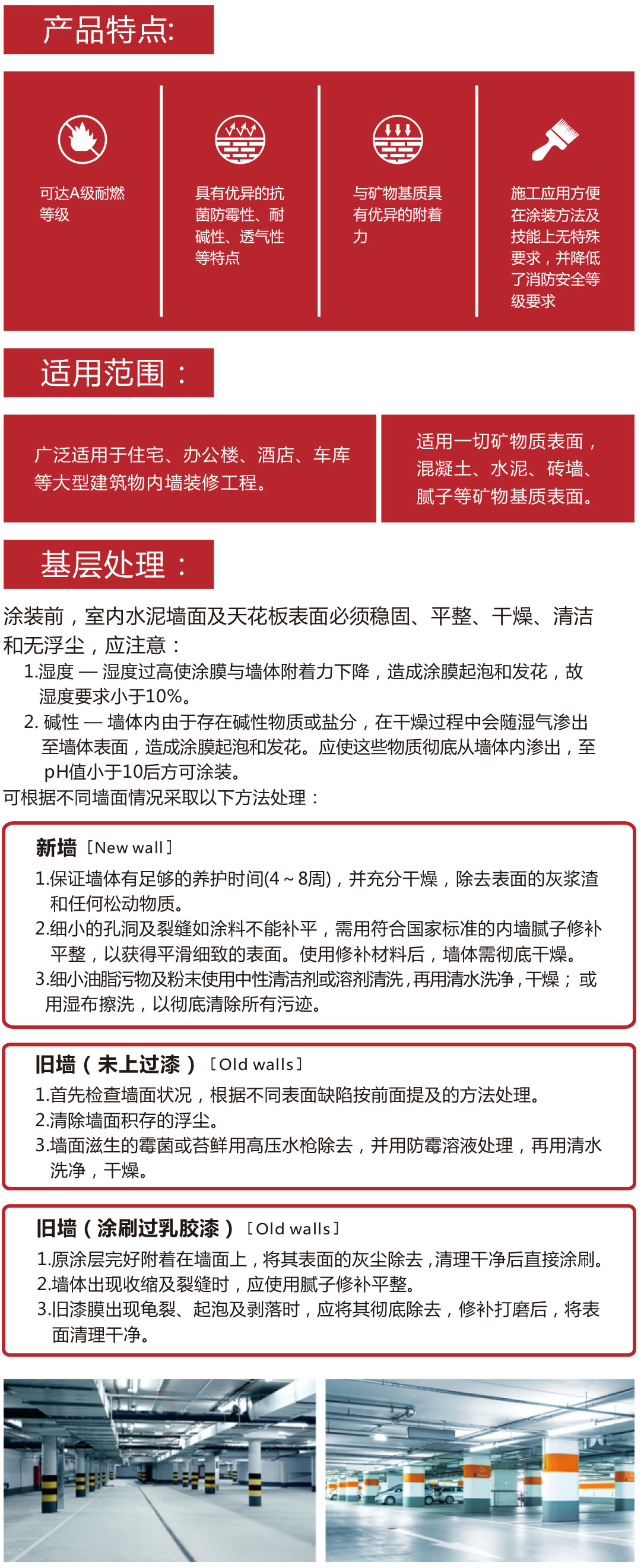 無(wú)機防霉防潮內墻水漆采用優(yōu)質(zhì)無(wú)機硅酸鹽為主要成膜物質(zhì),輔以?xún)?yōu)質(zhì)顏填料配制而成,可達到A級耐燃等級要求。具有優(yōu)異的抗菌防霉性、耐堿性等特點(diǎn),是一種新型的內墻環(huán)保產(chǎn)品。