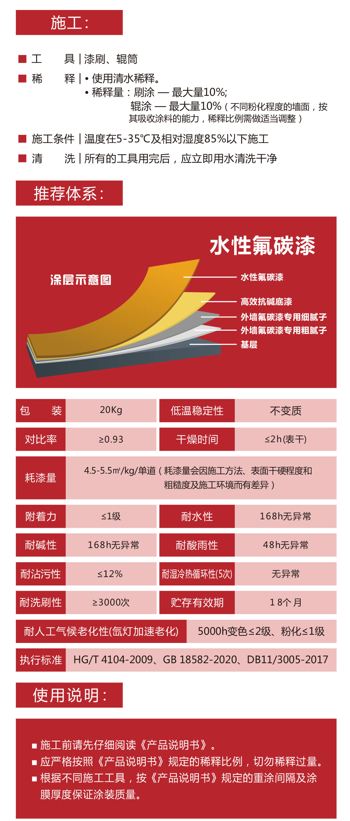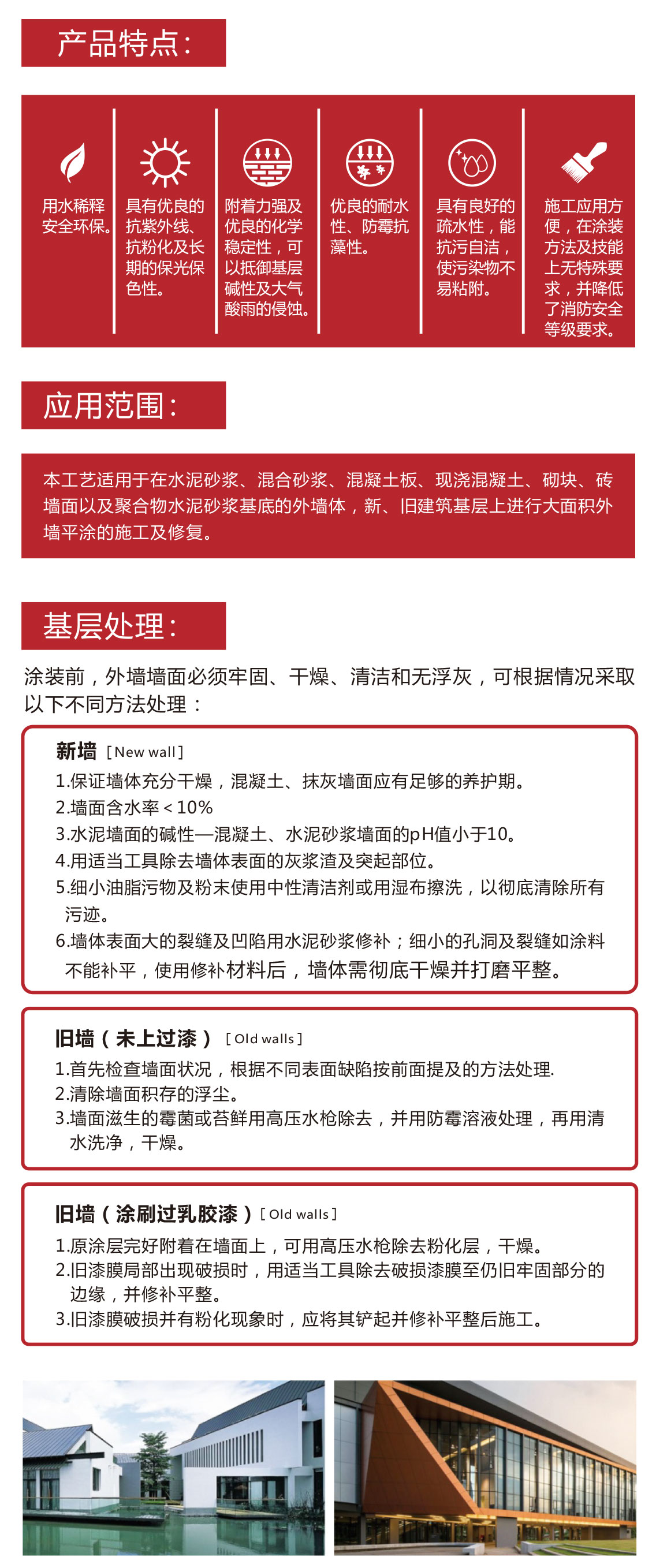 水性氟碳是采用水性乙烯基氟碳乳液為成膜物質(zhì),輔以?xún)?yōu)質(zhì)耐候效應顏料、助劑精制而成。具有耐久性好、耐侯性佳、保光保色性、透氣性、耐酸堿性、使用壽命長(cháng)及施工方便等特點(diǎn),是一種新型的耐抗環(huán)保產(chǎn)品。