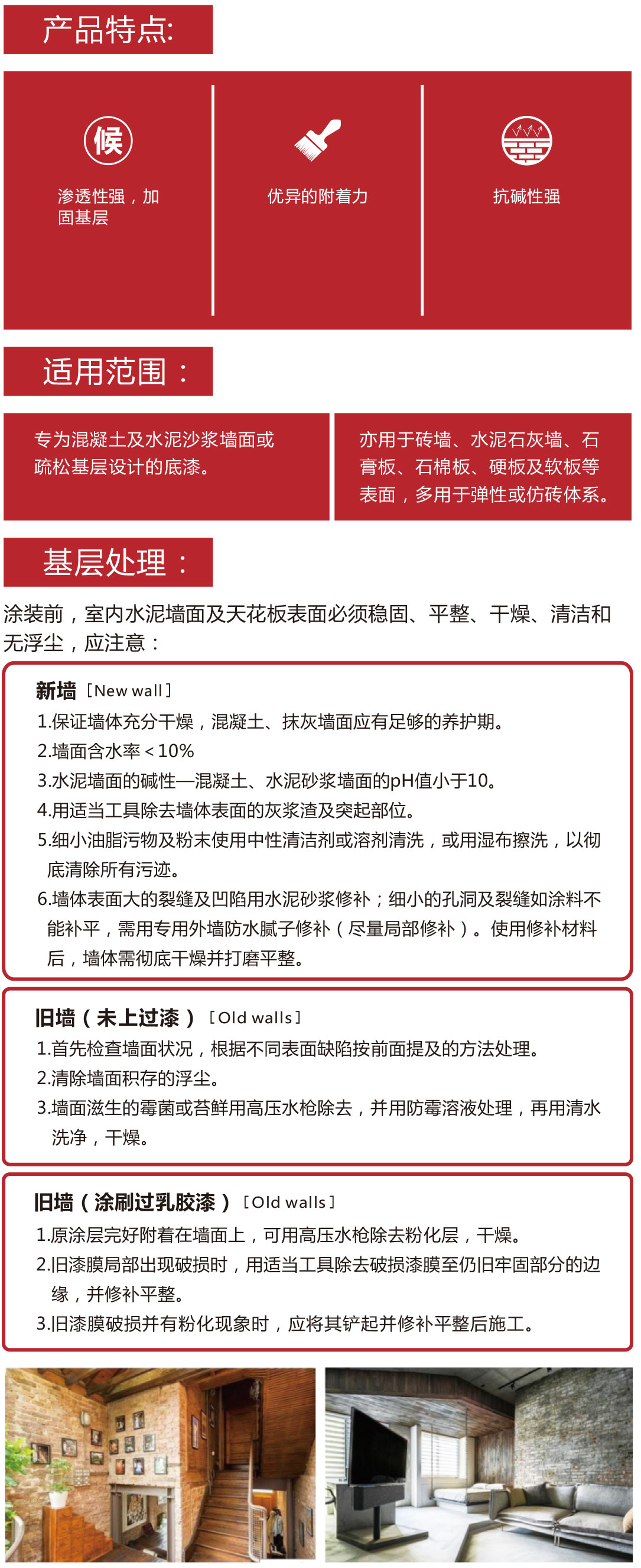 環(huán)氧改性丙烯酸類(lèi)底漆,有效能有效地保護乳膠漆面漆免受墻體內部的化學(xué)物質(zhì)的侵襲。